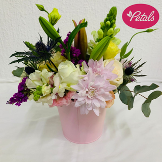 A pink tin with snapdragons ,roses,sprays,lilies,seaholly and greens,