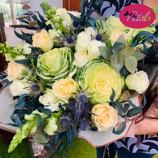 A bouquet with kale,snaps,roses ,sea holly and greens .