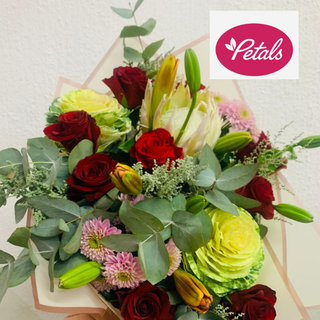 A colourful bouquet of red roses,kale,mixed sprays,proteas,,lilies and greens